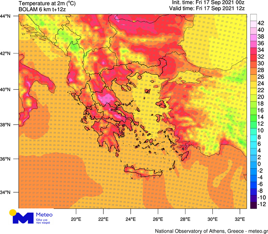 Στον χάρτη που ακολουθεί παρουσιάζονται οι θερμοκρασίες που αναμένονται στην χώρα μας το μεσημέρι της Παρασκευής 17 Σεπτεμβρίου.