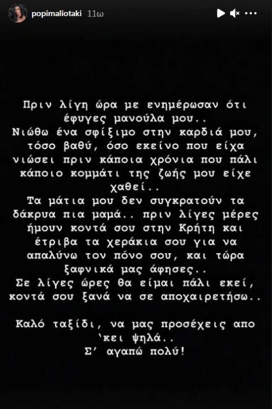 «Πριν λίγη ώρα με ενημέρωσαν ότι έφυγες μανούλα μου. Νιώθω ένα σφίξιμο στην καρδιά μου, τόσο βαθύ, όσο εκείνο που είχα νιώσει πριν κάποια χρόνια που πάλι κάποιο κομμάτι της ζωής μου είχε χαθεί… Τα μάτια μου δεν συγκρατούν τα δάκρια πια μαμά… Πριν λίγες μέρες ήμουν κοντά σου στην Κρήτη και έτριβα τα χεράκια σου για να απαλύνω τον πόνο σου, και τώρα ξαφνικά μας άφησες. Σε λίγες ώρες θα είμαι πάλι εκεί, κοντά σου ξανά να σε αποχαιρετήσω. Καλό ταξίδι, να μας προσέχεις από ‘κει ψηλά. Σ΄ αγαπώ πολύ… », έγραψε η Πόπη Μαλιωτάκη.
