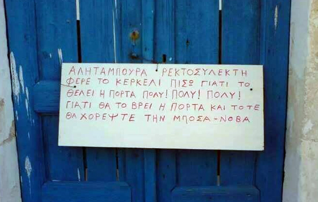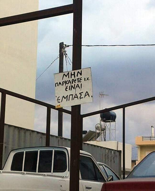 Οι τοπικές ιστοσελίδες, blog.mantinades.gr και candianews, φιλοξενούν μερικές από τις ξεκαρδιστικές πινακίδες που καταγράφτηκαν στο νησί.