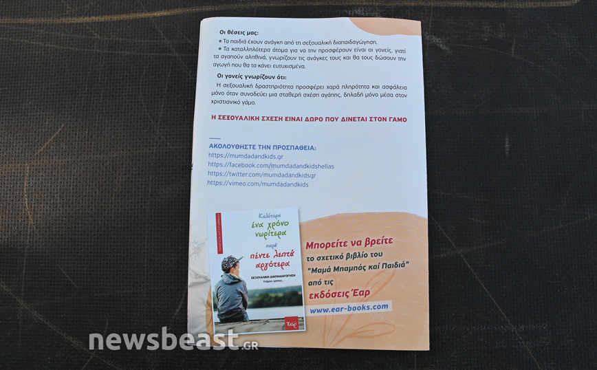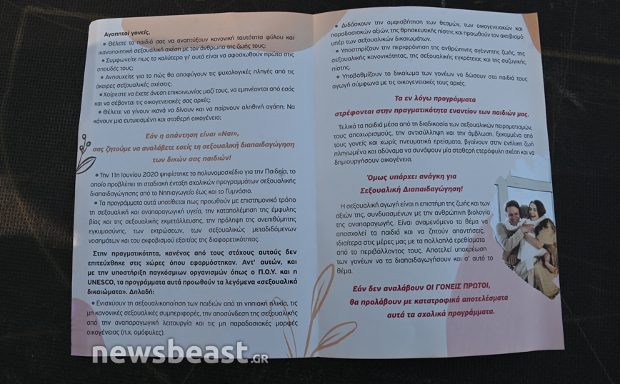 Στη συγκέντρωση μοιράζεται φυλλάδιο στο οποίο αναγράφεται ότι η «σεξουαλική διαπαιδαγώγηση είναι θέμα της οικογένειας» καθώς και ότι «η σεξουαλική σχέση είναι δώρο που δίνεται στον γάμο».