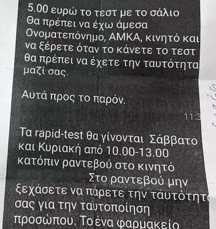 Πριν από μερικές ημέρες στη Θεσσαλονίκη, ο Ιατρικός Σύλλογος της πόλης εξέδωσε την παρακάτω ανακοίνωση: «Έπειτα από καταγγελίες που αφορούν την λειτουργία φορέα διενέργειας rapid test σε 3 διαφορετικές περιοχές της Θεσσαλονίκης, ο οποίος δεν έχει αδειοδοτηθεί από τον Ιατρικό Σύλλογο Θεσσαλονίκης και συνεπώς δεν γνωρίζουμε αν πληροί τις απαραίτητες προϋποθέσεις καθώς και αν απασχολεί επαγγελματίες του τομέα υγείας απευθυνθήκαμε με κατεπείγουσα επιστολή μας στην Εισαγγελία Θεσσαλονίκης, προκειμένου να επέμβει άμεσα, διότι τα παραπάνω αναφερόμενα άπτονται της Δημόσιας Υγείας».