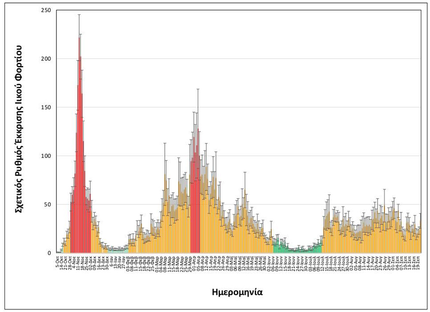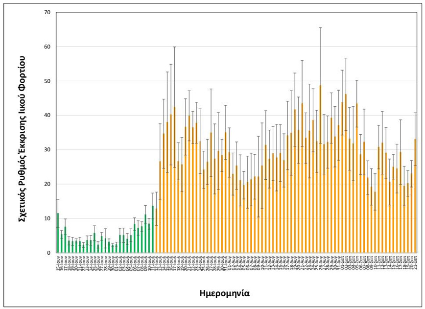 - αυξημένη (41%) σε σχέση με τη μέση τιμή των δύο αμέσως προηγούμενων μετρήσεων, του Σαββάτου 18/09 και της Κυριακής 19/09,