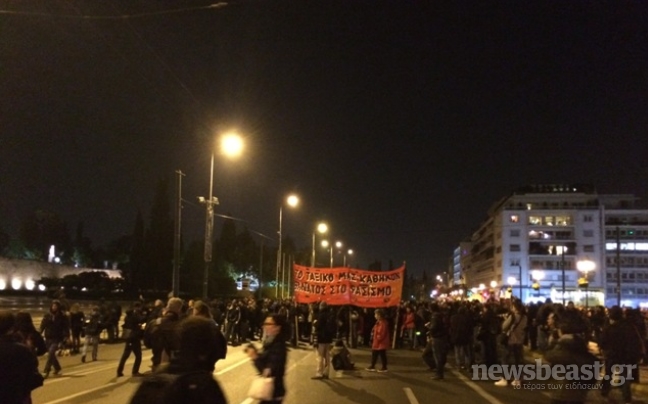 Σε εξέλιξη βρίσκεται η αντιφασιστική πορεία στο κέντρο της Αθήνας, με τη συμμετοχή περίπου 2.000 ατόμων.