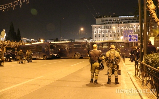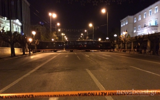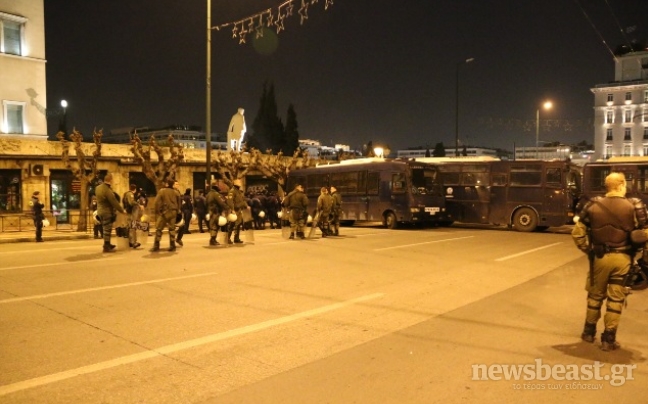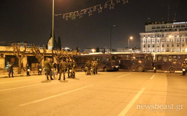 Η πορεία βρίσκεται κοντά στην πλατεία Συντάγματος, ενώ η αστυνομία «λάμπει» δια της απουσίας της, καθώς το μοναδικό σημείο όπου ξεχωρίζει η αστυνομική παρουσία είναι οι παρατεταγμένες κλούβες στη λεωφόρο Βασιλίσσης Σοφίας.