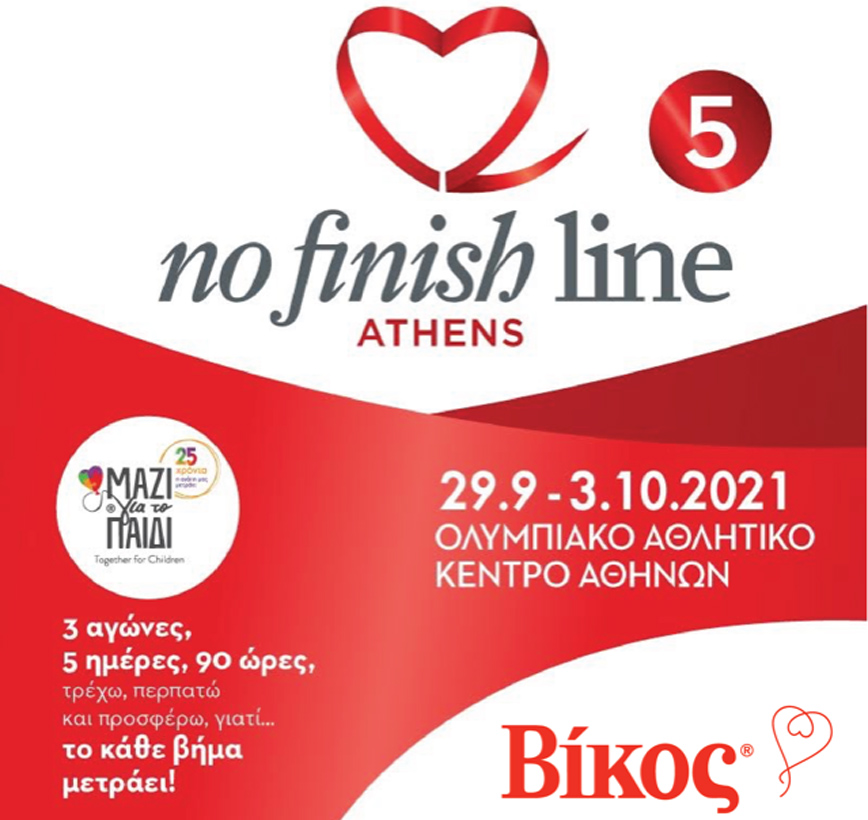 Κάπου να φτάσουμε, να φτιάξουμε, να δράσουμε, τις δυσκολίες να ξεπεράσουμε Η εταιρεία Bίκος υποστηρίζει έμπρακτα το μεγαλύτερο φιλανθρωπικό αγώνα τρεξίματος και βαδίσματος No Finish Line Athens, ως επίσημος χορηγός της 5ης διοργάνωσης, τα έσοδα του οποίου θα διατεθούν στην Ένωση «Μαζί για το Παιδί, γιατί όταν ένα παιδί έχει ανάγκη, δεν υπάρχει γραμμή τερματισμού!