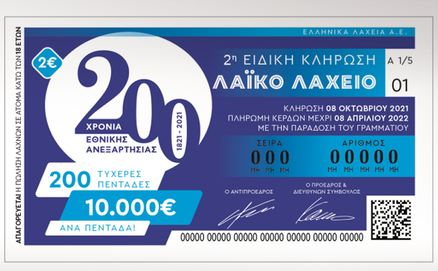 Λίγες ημέρες έχουν απομείνει μέχρι τη νέα ειδική κλήρωση του Λαϊκού Λαχείου «200 Χρόνια Εθνικής Ανεξαρτησίας». Την Παρασκευή, 8 Οκτωβρίου, τρεις ημέρες μετά την καθιερωμένη κλήρωση της Τρίτης, το παιχνίδι θα μοιράσει έπαθλα των 10.000 ευρώ σε 200 νικητές.