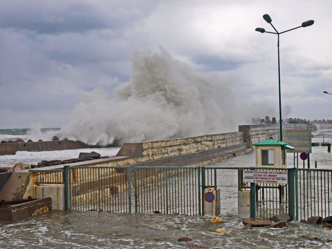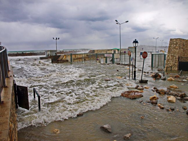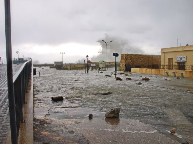 Έντονα καιρικά φαινόμενα πλήττουν την Κρήτη. Στο Ρέθυμνο η θάλασσα βγήκε στη στεριά, προκαλώντας προβλήματα στην πόλη.