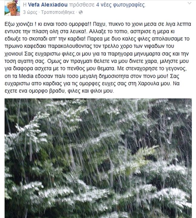 «Εξω χιονίζει ! κι είναι τόσο ομορφα!! Παχυ, πυκνο το χιονι μεσα σε λιγα λεπτα εντυσε την πλαση ολη στα λευκα!. Αλλαξε το τοπιο, ασπρισε η μερα κι εδιωξε το σκοταδι απ’ την καρδια! Παρεα με δυο καλες φιλες απολαυσαμε το πρωινο καφεδακι παρακολουθοντας τον τρελλο χορο των νιφαδων του χιονιουΙ Σας ευχαριστω φιλες,οι μου για τα παρηγορα μηνυματα σας και την τοση αγαπη σας. Ομως αν πραγματι θελετε να μου δινετε χαρα, μιληστε μου για διαφορα ασχετα με το πενθος μου θεματα. Με στεναχώρησε το γεγονος, οτι τα Media έδωσαν πάλι τοσο μεγαλη δημοσιοτητα στον πονο μου! Σας ευχαριστω απο καρδιας για τις ομορφες ευχες σας στη Χαρουλα μου. Να εχετε ενα ομορφο βραδυ, φιλες και φιλοι μου.»