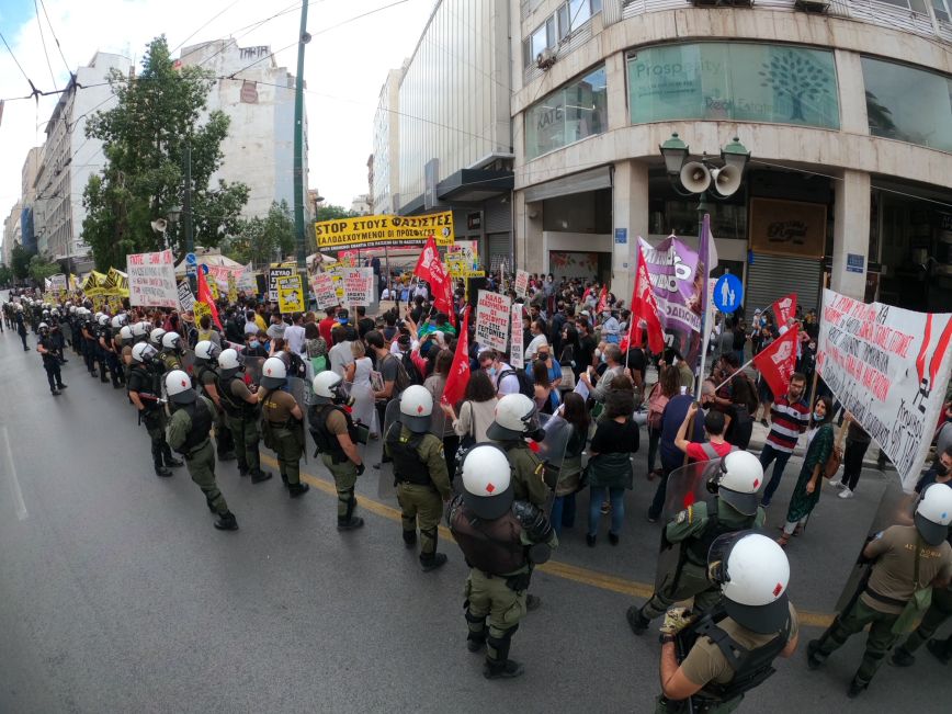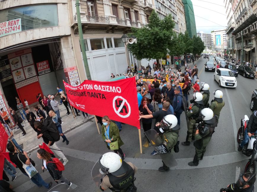 Mέλη της ΚΕΕΡΦΑ, η ΑΔΕΔΥ, φοιτητικοί σύλλογοι, κοινότητες μεταναστών, πρόσφυγες από τα στρατόπεδα, άνθρωποι των Γραμμάτων και των τεχνών, οργανώσεις και κόμματα της Αριστεράς συγκεντρώθηκαν να στείλουν ένα μήνυμα κατά της φασιστικής βίας, με αφορμή και τη συμπλήρωση ενός έτους από την καταδίκη της Χρυσής Αυγής.