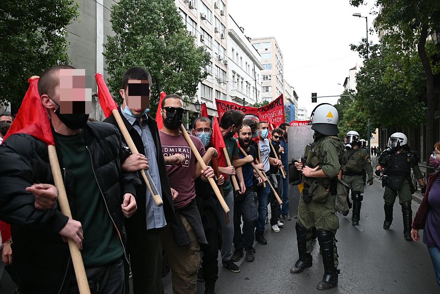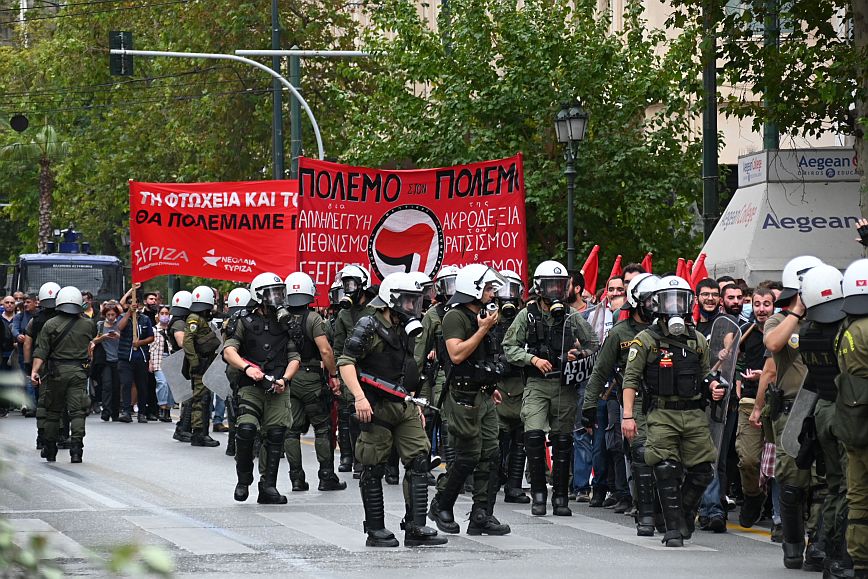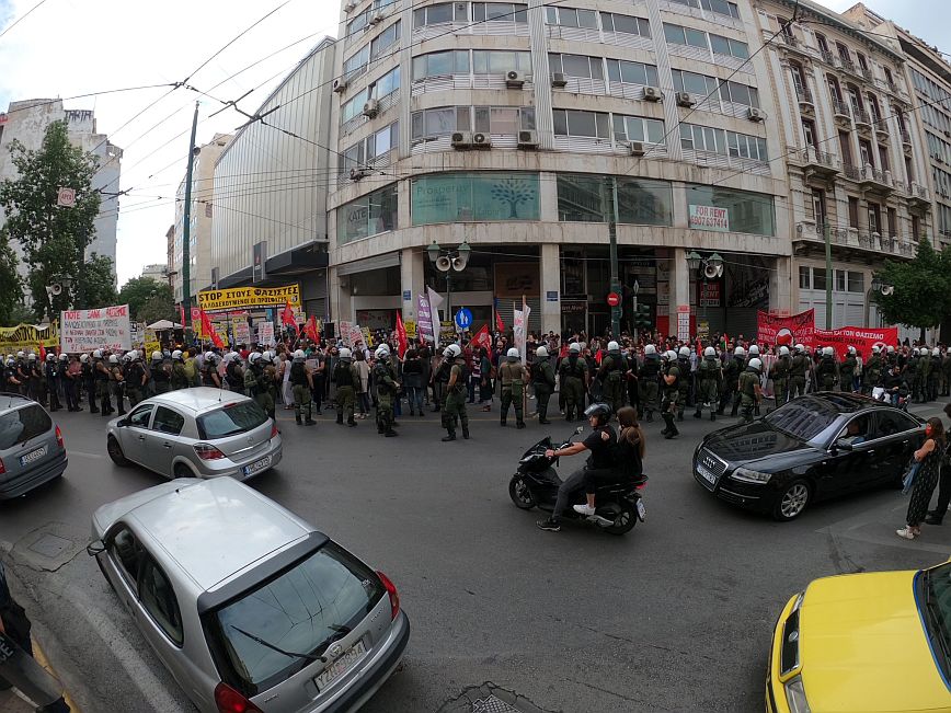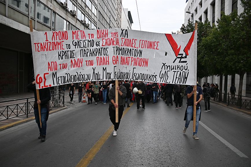 Αντιφασιστική πορεία στο κέντρο της Αθήνας πραγματοποιήθηκε το μεσημέρι, με αφετηρία την Ομόνοια και επιστροφή στο ίδιο σημείο και με αφορμή τον ένα χρόνο από τη δικαστική καταδίκη της εγκληματικής οργάνωσης της Χρυσής Αυγής.