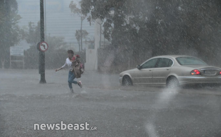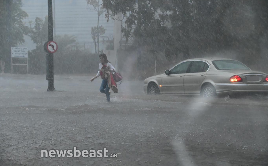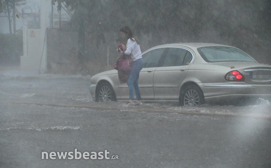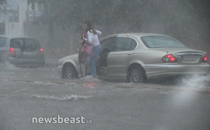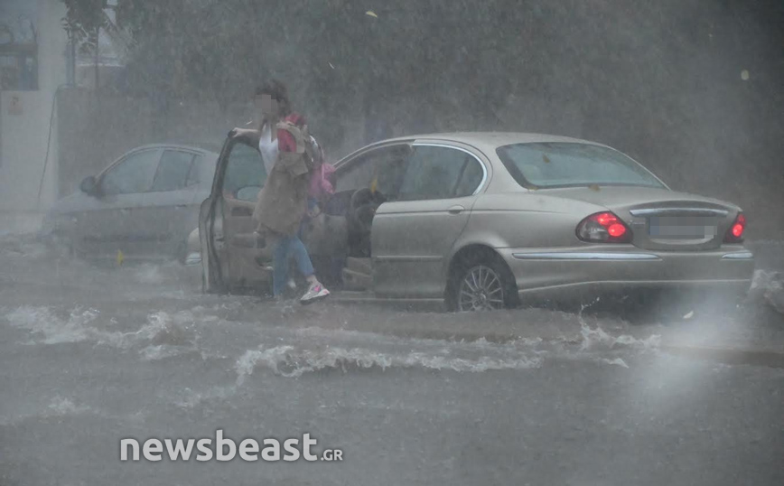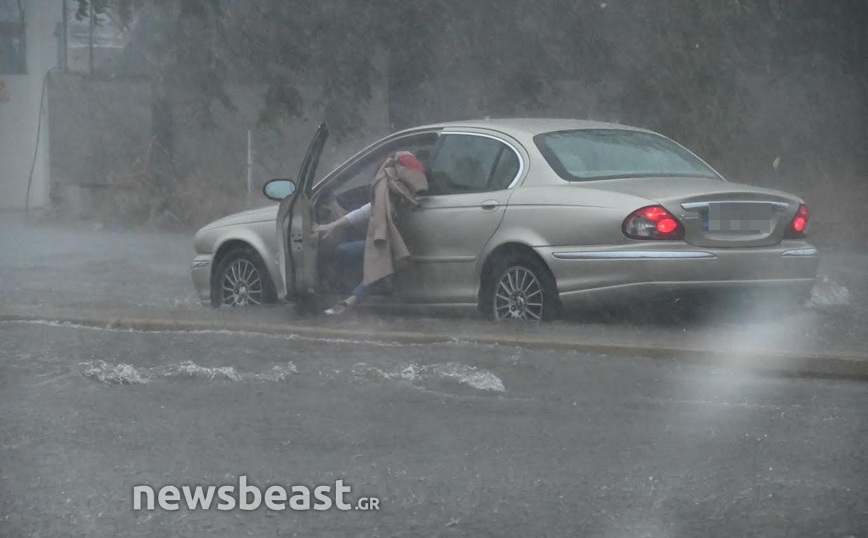Η Πειραιώς θυμίζει ποτάμι. Χαρακτηριστικό είναι το περιστατικό που καταγράφηκε με μία οδηγό να εγκαταλείπει το αυτοκίνητό της στη μέση του δρόμου καθώς τα νερά έφτασαν στις πόρτες του.