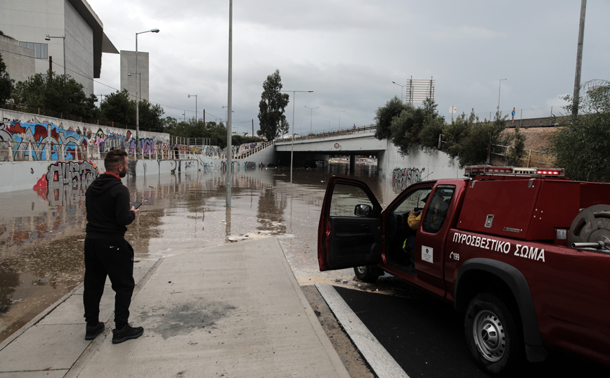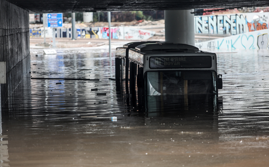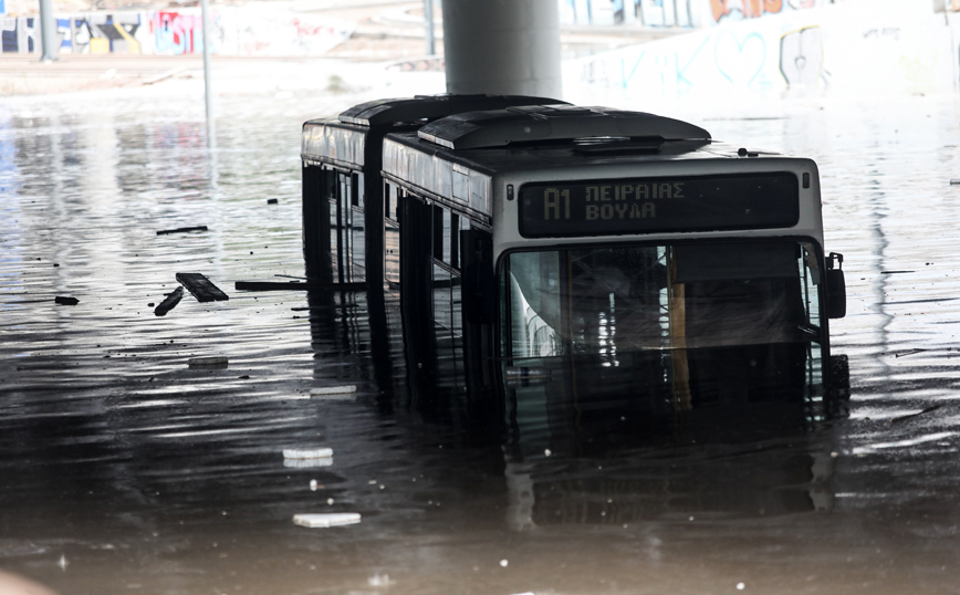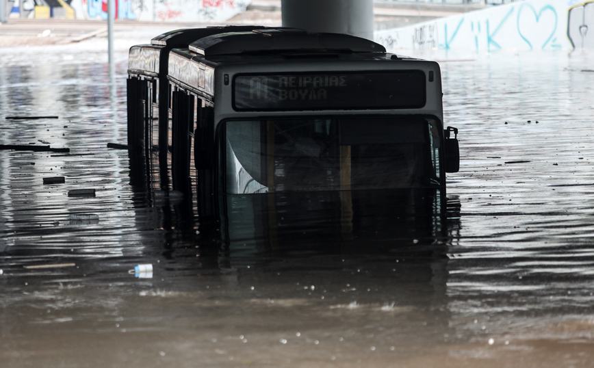 Το λεωφορείο, που εκτελεί τη διαδρομή Πειραιάς – Βούλα, φαίνεται να έχει καλυφθεί σχεδόν από το νερό ενώ είναι ακινητοποιημένο κάτω από τη γέφυρα στο ύψος του ιδρύματος Σταύρος Νιάρχος.