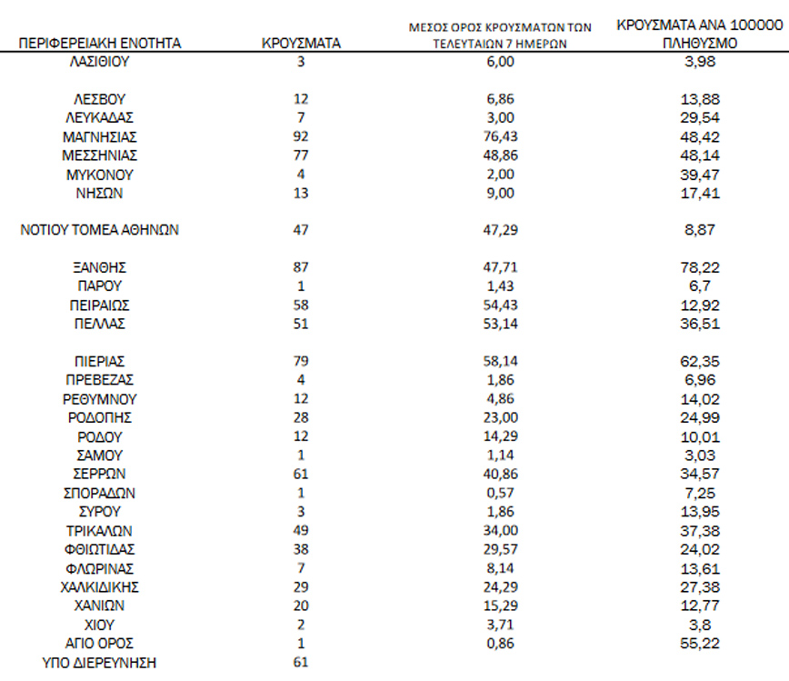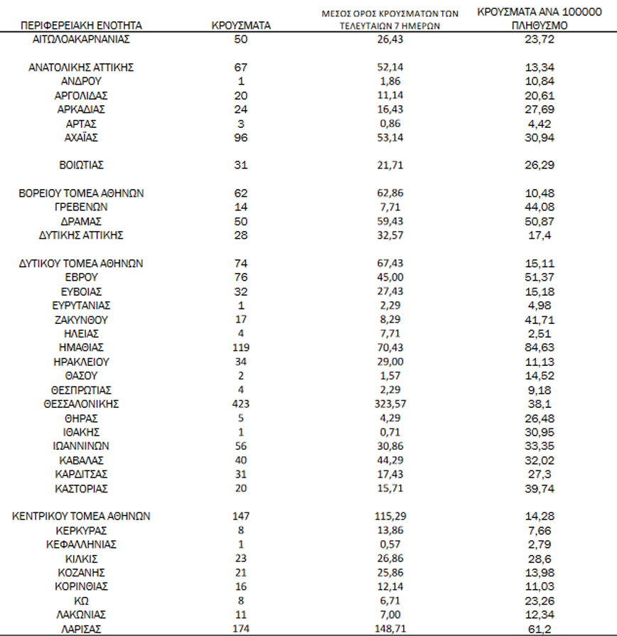 Συγκεκριμένα η Αττική έχει 496 νέα κρούσματα κορονοϊού, η Θεσσαλονίκη 423, η Λάρισα 174 και η Ημαθία 119.
