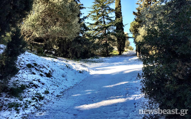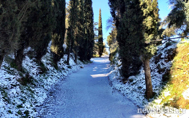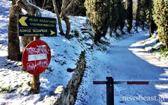 Στα λευκά ντύθηκε το πρωί της Πέμπτης η μονή Καισαριανής, προσφέροντας μια ξεχωριστή ευκαιρία σε όσους επιλέξουν να την επισκεφτούν για να απολαύσουν το χιονισμένο τοπίο.