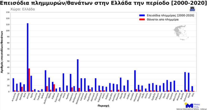 Αναλυτικότερα, στην Ελλάδα, κατά την περίοδο 2000-2020, καταγράφηκαν πάνω από 380 επεισόδια πλημμύρας με αρνητικές κοινωνικές και οικονομικές επιπτώσεις, 132 ανθρώπινες απώλειες (οι 38 στην Αττική), υλικές ζημιές και καταστροφές υποδομών, προβλήματα σε μετακινήσεις κλπ. Η Αττική επλήγη στο 30% των περιπτώσεων αυτών, σύμφωνα με σχετική ανάλυση των ερευνητών του meteo του Εθνικού Αστεροσκοπείου Αθηνών Κ. Παπαγιαννάκη, Κ. Λαγουβάρδου και Β. Κοτρώνη.