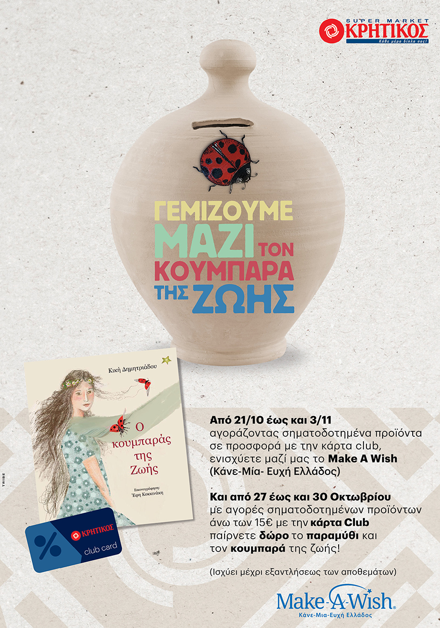 Από τις 21/10 έως και τις 3/11, αγοράζοντας σηματοδοτημένα προϊόντα σε προσφορά με την κάρτα Club ΚΡΗΤΙΚΟΣ, οι καταναλωτές βοηθούν στην ενίσχυση του μη κερδοσκοπικού οργανισμού, Make-A-Wish Κάνε-Μια- Ευχή Ελλάδος.