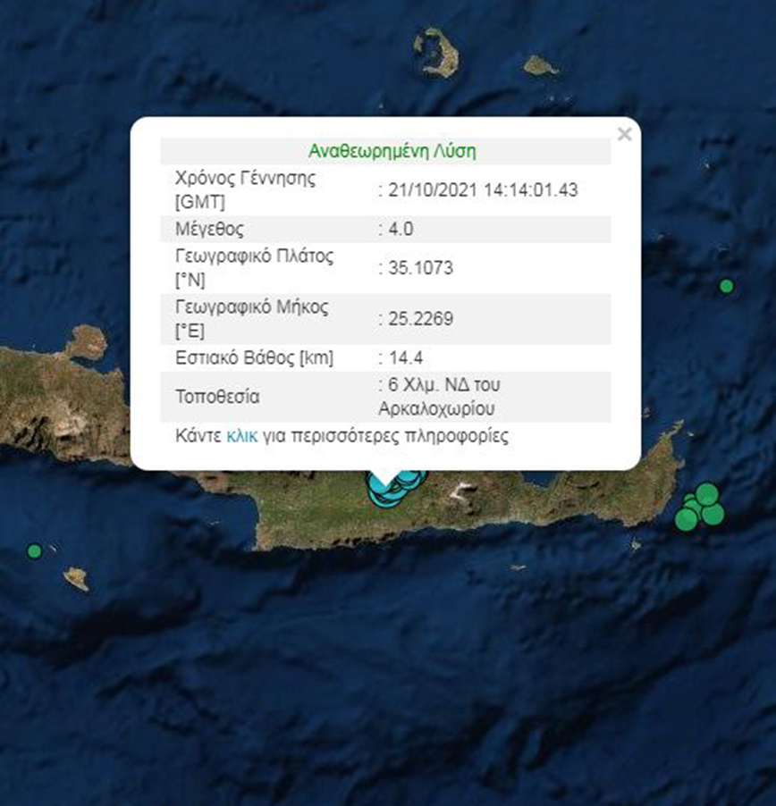 Συνεχίζεται η έντονη σεισμική ακολουθία στην Κρήτη και συγκεκριμένα στην ευρύτερη περιοχή του Αρκαλοχωρίου. Πριν λίγα λεπτά ακόμα ένας σεισμός ταρακούνησε το Αρκαλοχώρι της Κρήτης. Ο σεισμός είχε μέγεθος 4 Ρίχτερ ενώ το εστιακό του βάθος εντοπίστηκε στα 14,4 χιλιόμετρα.