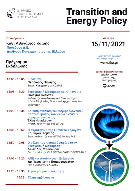 Ειδικότερα, ο πρόεδρος του Διεθνούς Πανεπιστημίου, ομότιμος καθηγητής Aθανάσιος Καΐσης, καλεί τους ενδιαφερόμενους να δηλώσουν συμμετοχή στην εκδήλωση, που φέρει τον τίτλο «Transition and Energy Policy», μέσω της ιστοσελίδας https://e-services.ihu.edu.gr/registration-form/2215/online-form, σημειώνοντας πως οι μετέχοντες θα λάβουν ακολούθως και βεβαίωση παρακολούθησης.