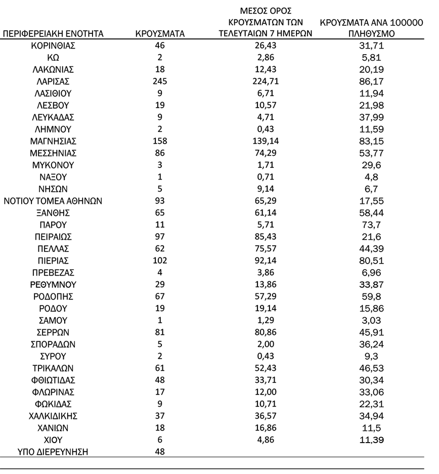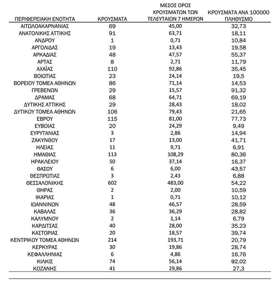 Συγκεκριμένα η Αττική έχει 721 νέα κρούσματα κορονοϊού, η Θεσσαλονίκη 602, η Λάρισα 245, η Μαγνησία 158, ο Έβρος 115, η Πιερία 102, η Αχαΐα 110 και η Ημαθία 113.