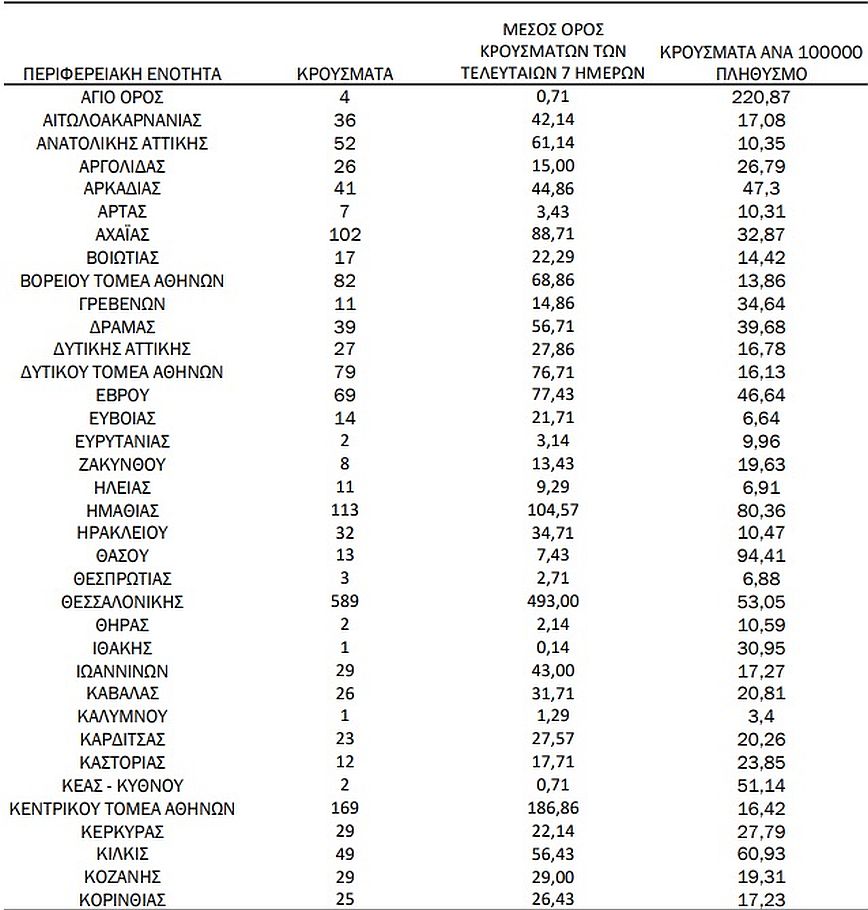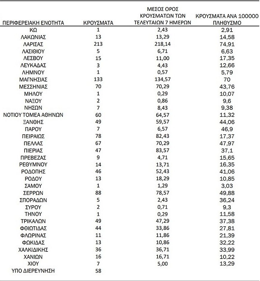 Αναλυτική η κατανομή των κρουσμάτων ανά περιφέρεια σύμφωνα με τα στοιχεία του ΕΟΔΥ: