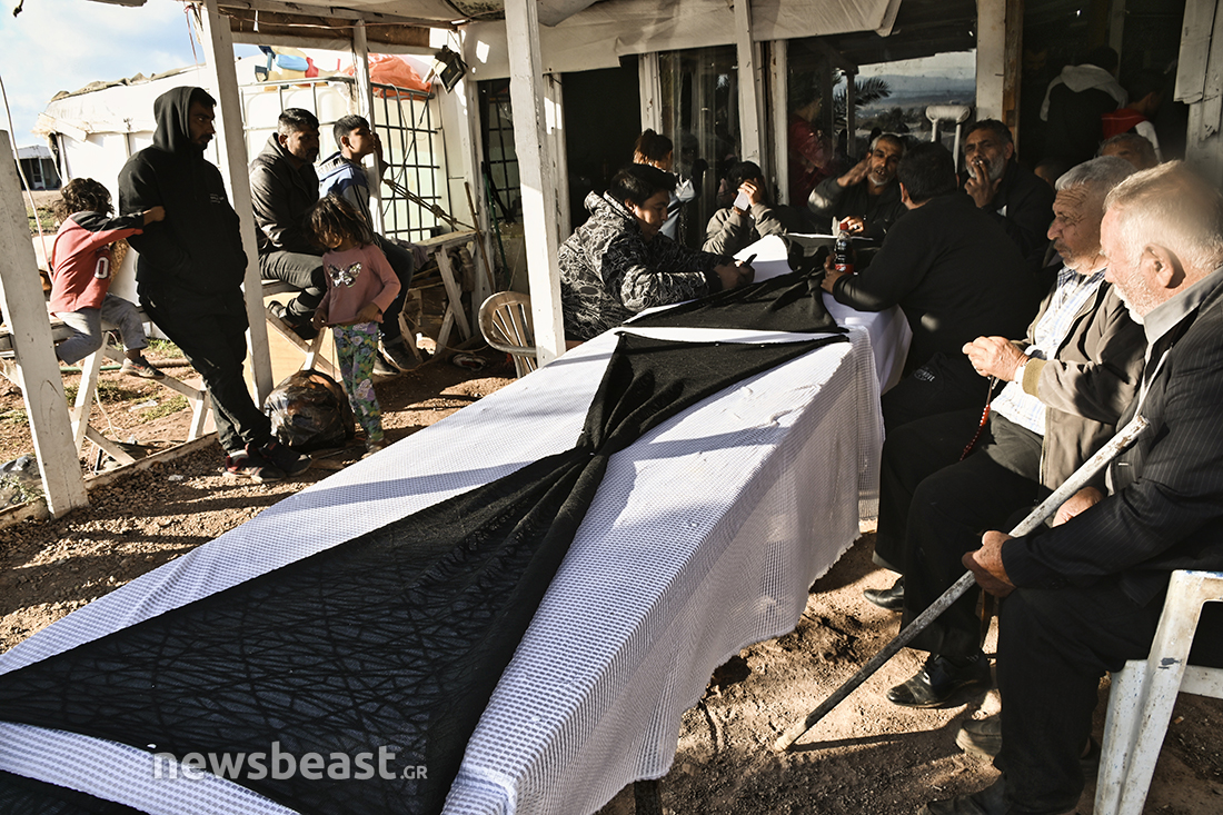 Οι εικόνες αλλάζουν μόνο όταν πλησιάζουμε σε ένα κεντρικό σημείο του συνοικισμού, σε ένα χώρο σαν κοινόχρηστο καφενείο με εσωτερική αίθουσα. Γύρω στους 100 Ρομά όλων των ηλικιών έχουν συγκεντρωθεί για να τελέσουν το μνημόσυνο των 7 ημερών από τον θάνατο του Νίκου Σαμπάνη. Το συγκεκριμένο έθιμο έχει μεγάλη σημασία για τους Ρομά.