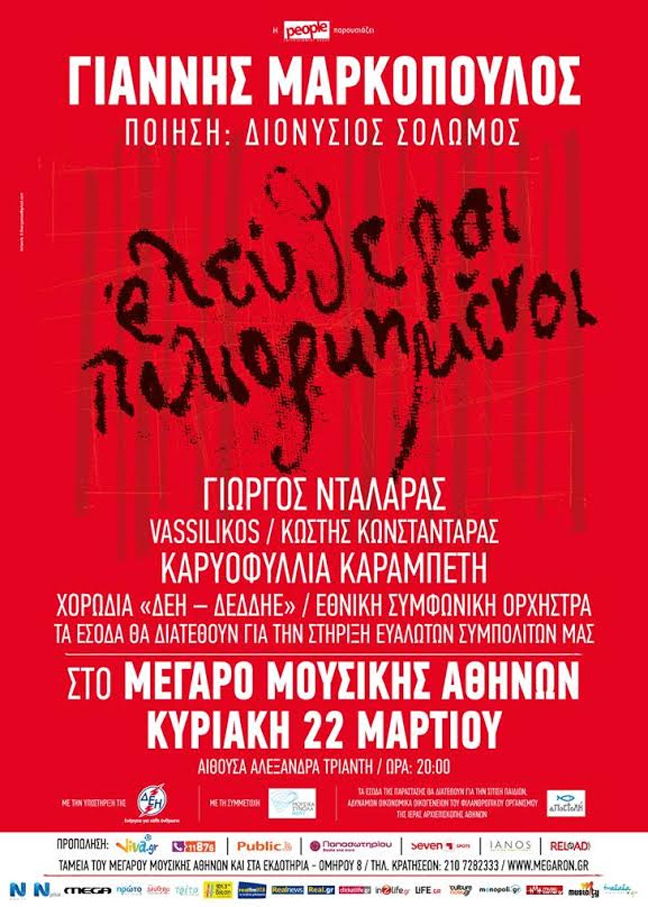 Η ΔΕΗ ΑΕ, είναι ο κεντρικός υποστηρικτής του εμβληματικού μουσικού έργου «Ελεύθεροι Πολιορκημένοι», σε ποίηση του εθνικού ποιητή Διονυσίου Σολωμού, το οποίο θα παρουσιάσει και διευθύνει ο μεγάλος συνθέτης Γιάννης Μαρκόπουλος στο Μέγαρο Μουσικής Αθηνών την Κυριακή 22 Μαρτίου.