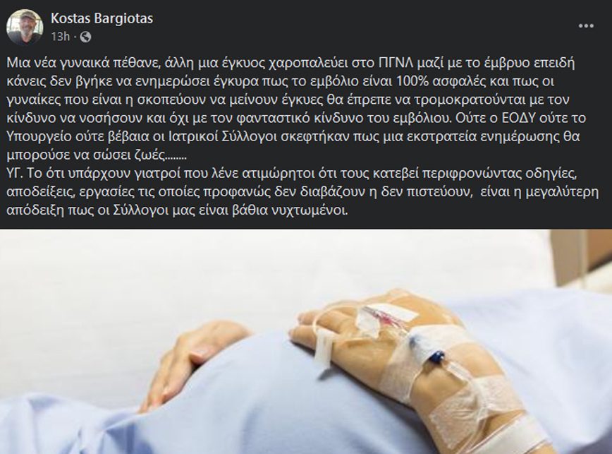 «Μια νέα γυναικά πέθανε, άλλη μια έγκυος χαροπαλεύει στο ΠΓΝΛ μαζί με το έμβρυο επειδή κάνεις δεν βγήκε να ενημερώσει έγκυρα πως το εμβόλιο είναι 100% ασφαλές και πως οι γυναίκες που είναι η σκοπεύουν να μείνουν έγκυες θα έπρεπε να τρομοκρατούνται με τον κίνδυνο να νοσήσουν και όχι με τον φανταστικό κίνδυνο του εμβόλιου. Ούτε ο ΕΟΔΥ ούτε το Υπουργείο ούτε βέβαια οι Ιατρικοί Σύλλογοι σκεφτήκαν πως μια εκστρατεία ενημέρωσης θα μπορούσε να σώσει ζωές……..