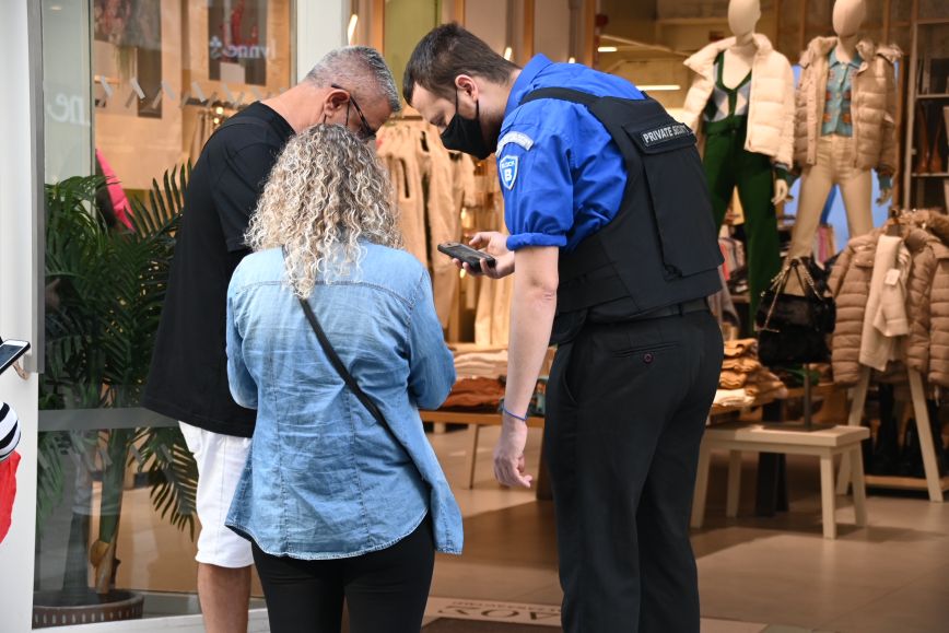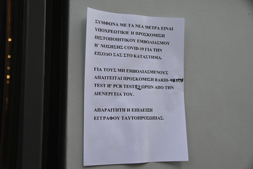 Από τις πρώτες ώρες αρκετά μαγαζιά έχουν βάλει ταμπέλες για τους ελέγχους που γίνονται, με κάποια εξ αυτών να έχουν άνθρωπο στην είσοδο για τους ελέγχους των πιστοποιητικών είτε μέσω της νέας εφαρμογής για το κινητό είτε με το κλασικό χαρτί.
