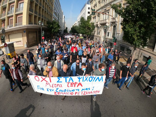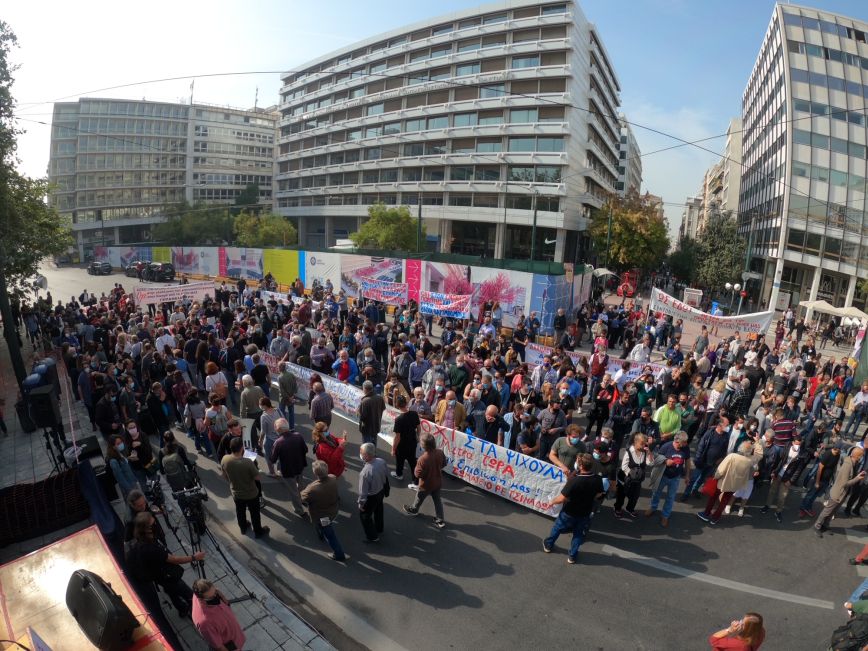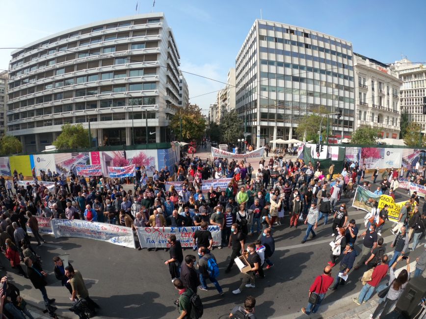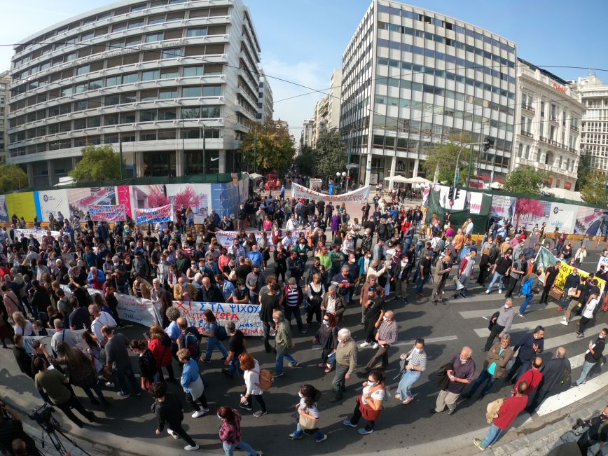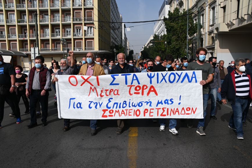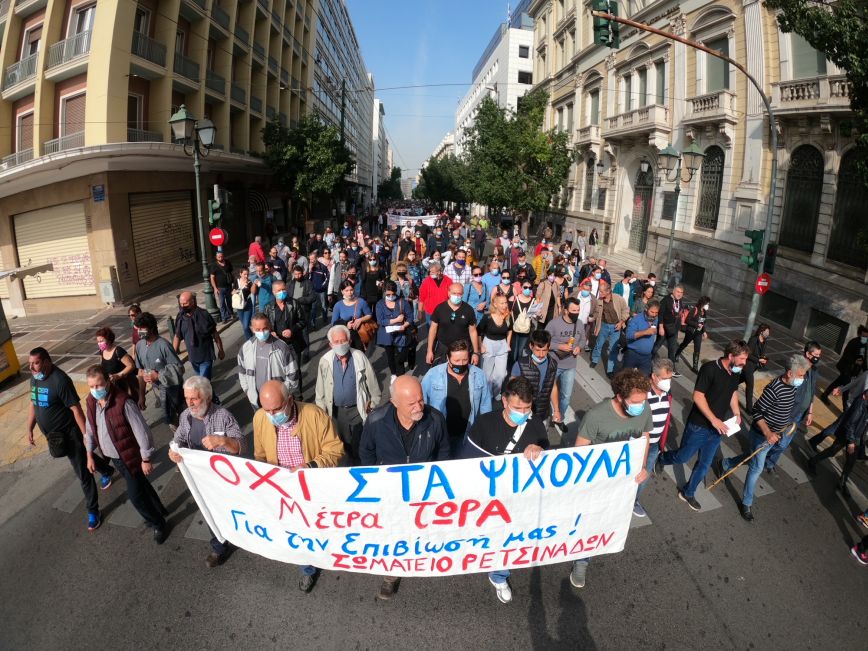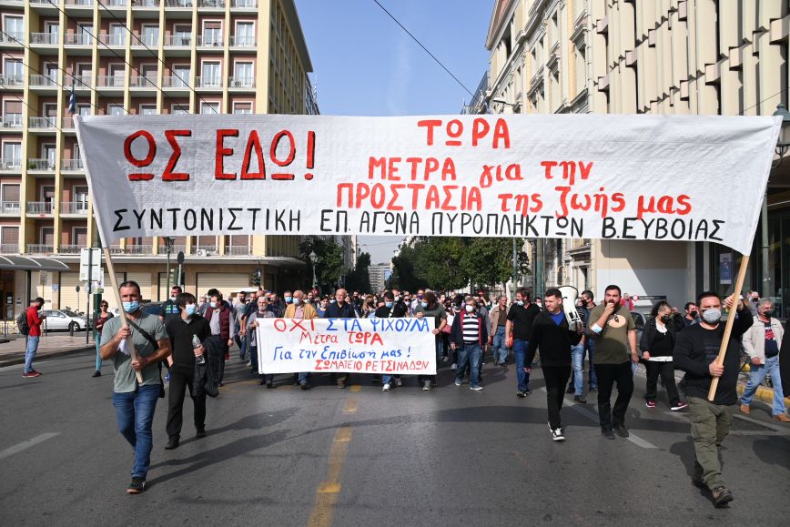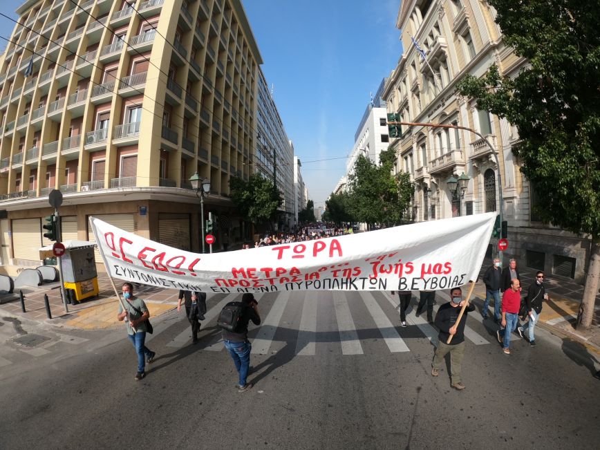 Πορεία στο κέντρο της Αθήνας πραγματοποιούν άνθρωποι που επλήγησαν από τις πυρκαγιές που κατέκαψαν τη Βόρεια Εύβοια τον Αύγουστο.