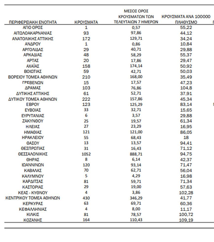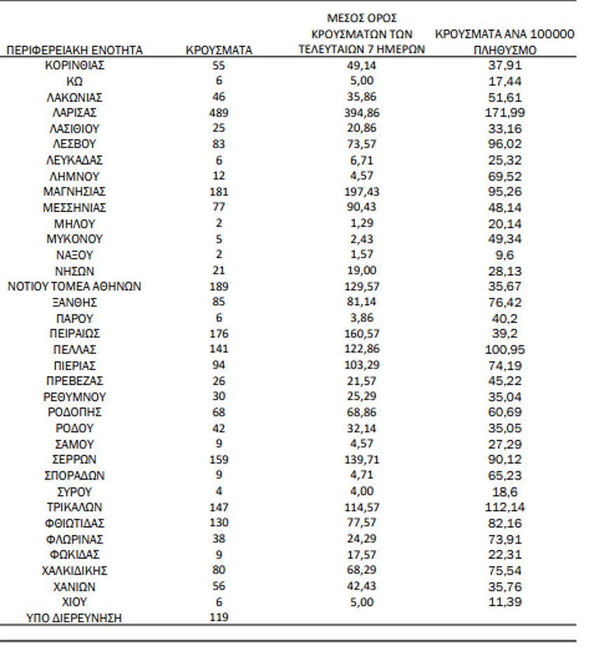 Την ίδια ώρα 1052 νέα κρούσματα καταγράφηκαν στη Θεσσαλονίκη. Στο κόκκινο παραμένει η Λάρισα με 489, η Μαγνησία με 181 και η Αχαΐα με 158.
