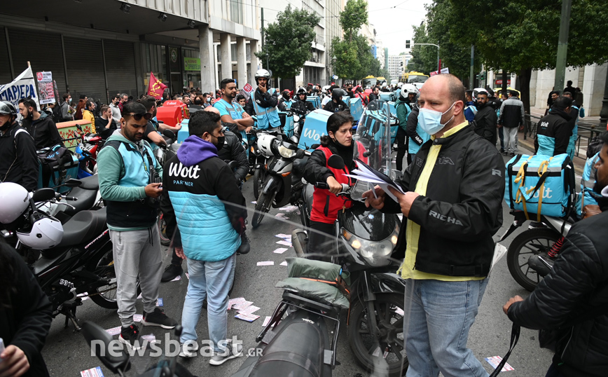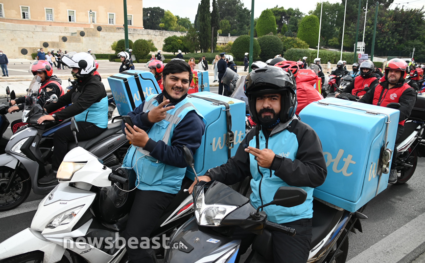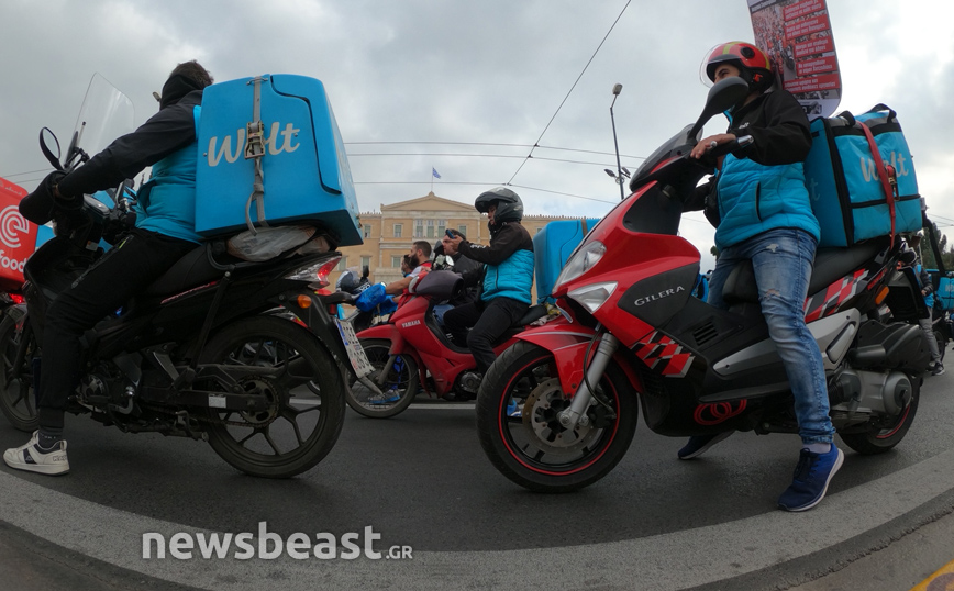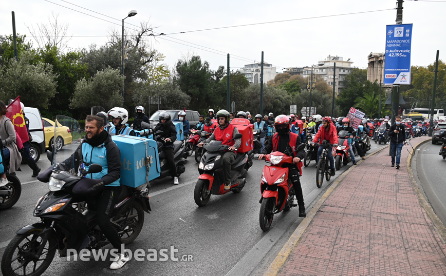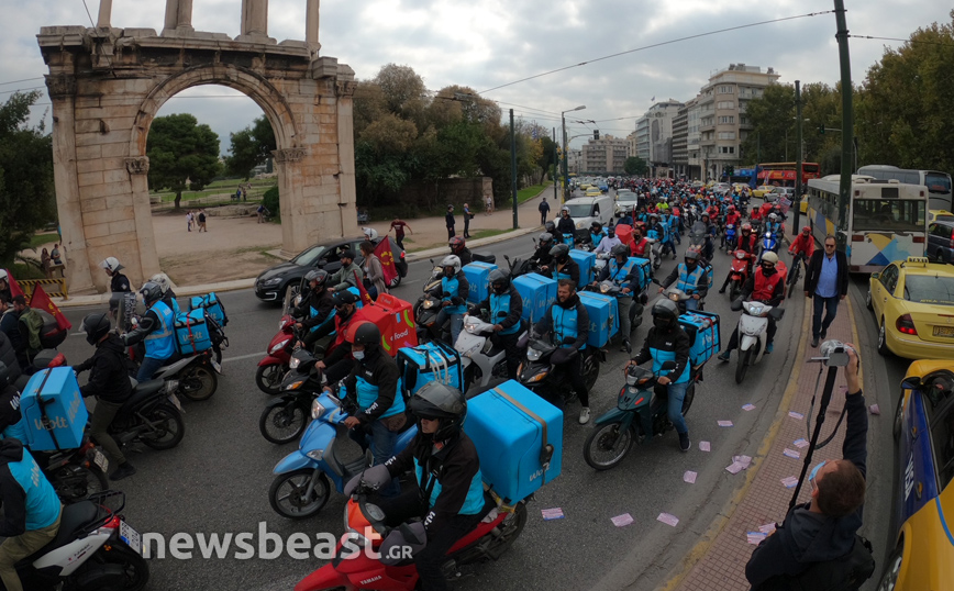 Στην κινητοποίηση δυναμικό παρών έδωσαν οι διανομείς με τα μηχανάκια τους οι οποίοι συναντήθηκαν στους Στύλους του Ολυμπίου Διός.