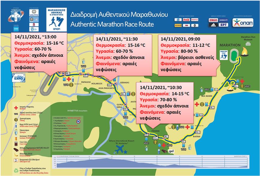 Μοναδικά αρνητικά στοιχεία θα είναι η σχετικά χαμηλή θερμοκρασία που αναμένεται κατά την έναρξη του Μαραθωνίου και η ελαφρά αυξημένη σχετική υγρασία.