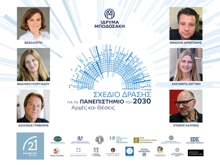 Η αρχή γίνεται με το Σχέδιο Δράσης για το Πανεπιστήμιο του 2030, το οποίο είναι διαθέσιμο εδώ, και θα παρουσιαστεί ως κείμενο συζήτησης στις 22 Νοεμβρίου στο Μέγαρο Μουσικής Αθηνών. Για τη δημιουργία του συστάθηκε, έπειτα από πρόσκληση του Ιδρύματος Μποδοσάκη, Επιστημονική Επιτροπή, η οποία συντονίζεται από την κυρία Βάσω Κιντή, Καθηγήτρια Φιλοσοφίας της Επιστήμης στο τμήμα Ιστορίας και Φιλοσοφίας της Επιστήμης του Εθνικού και Καποδιστριακού Πανεπιστημίου Αθηνών και αποτελείται από τους: