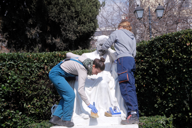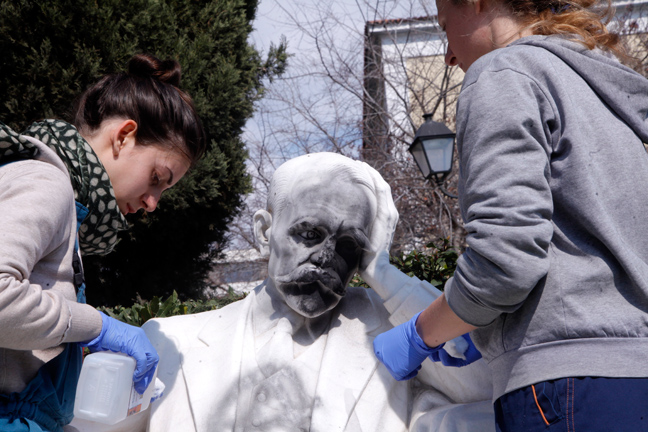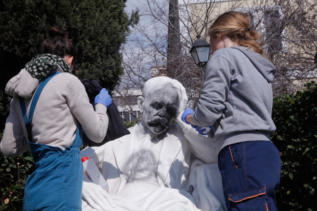 Από το πρωί της Πέμπτης, συνεργεία του Δήμου Αθηναίων προσπαθούν να αποκαταστήσουν τις ζημιές ενώ ειδικοί επιστήμονες προσπαθούν με λεπτομερή δουλειά να αποκαταστήσουν τις ζημιές στα αγάλματα που βρίσκονται έξω από την Νομική.