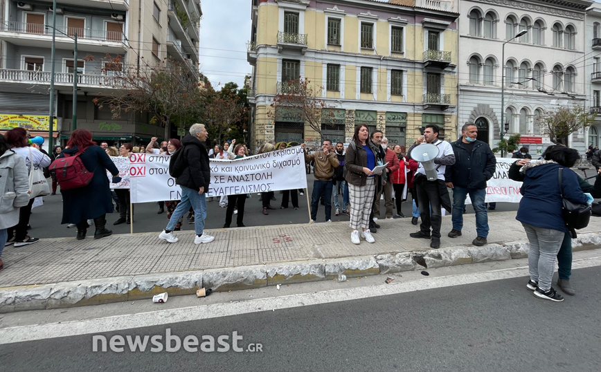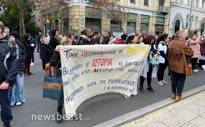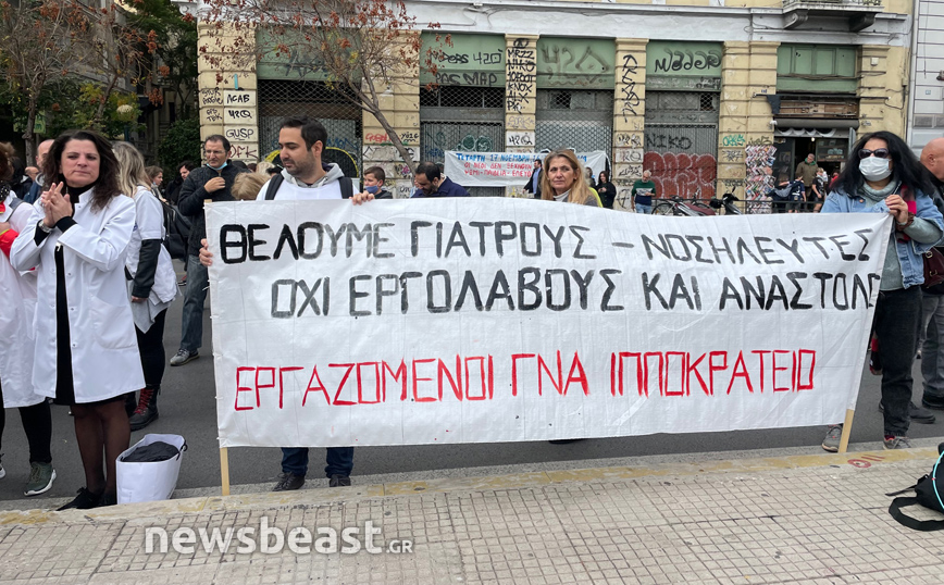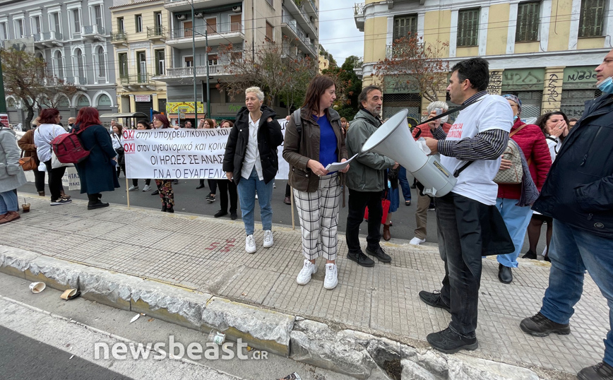 Με πανό στα χέρια που γράφουν: «Χθες ήρωες=σήμερα μολυσματικοί» και «Τους υγειονομικούς σε αναστολή θα γράψει η ιστορία κι όχι αυτούς που ρίξανε στο μαύρο την κοινωνία» οι υγειονομικοί διαμαρτύρονται κατά της υποχρεωτικότητας των εμβολιασμών.