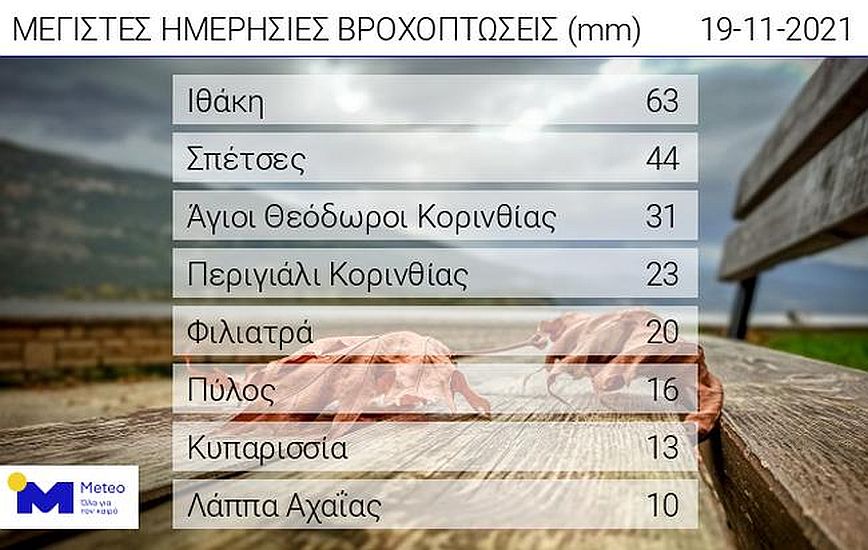 Στον πίνακα που ακολουθεί παρουσιάζοντα οι 8 σταθμοί που κατέγραψαν τα μεγαλύτερα ύψη βροχής. Μετά την Ιθάκη ακολουθούν οι Σπέτσες (44 χιλ.) και οι Άγιοι Θεόδωροι Κορινθίας (31 χιλ.).
