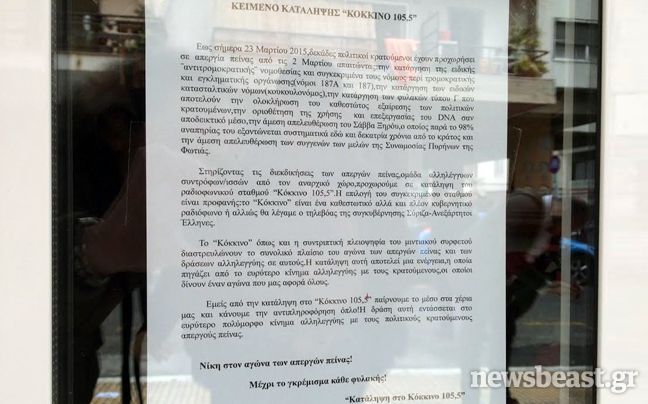 Αφίσες με τα αιτήματά τους κόλλησαν στο κτίριο του ραδιοφωνικού σταθμού «Στο Κόκκινο» οι αντιεξουσιαστές που προχώρησαν σήμερα στην κατάληψή του.