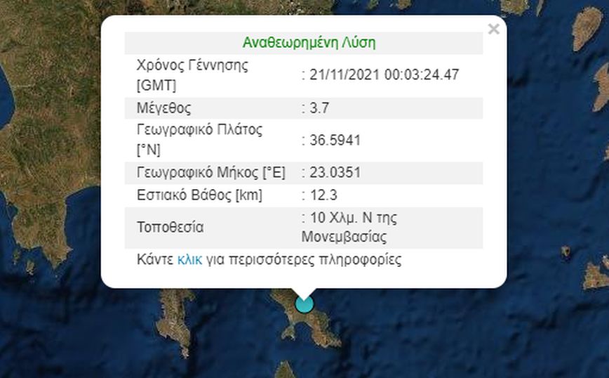 Το επίκεντρο του σεισμού που σημειώθηκε στις 02:03 εντοπίστηκε 10χλμ. νότια της Μονεμβασιάς, με το εστιακό βάθος να υπολογίζεται στα 12χλμ.