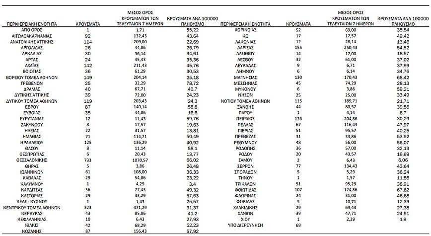 Την ίδια ώρα στο «κόκκινο» παραμένουν η Θεσσαλονίκη με 733 κρούσματα , η Λάρισα με 155, η Αχαΐα με 142 και η Μαγνησία με 130 νέα κρούσματα.