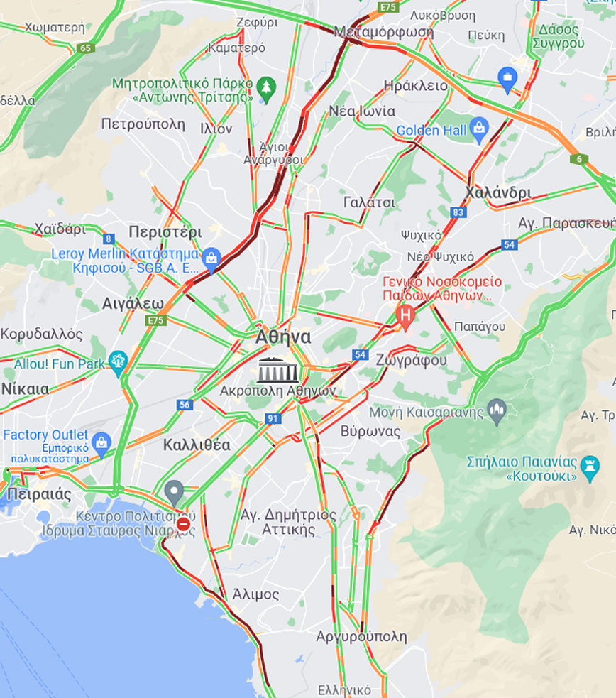 Κίνηση τώρα: Ο χάρτης της Google με την κίνηση στους δρόμους ώρα 08:44