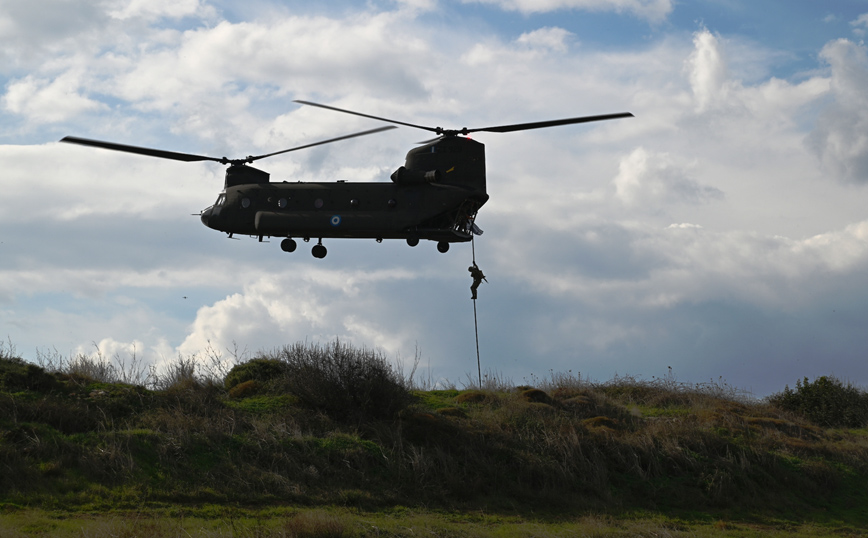 Στη συνέχεια, προσωπικό των Ενόπλων Δυνάμεων αποβιβάζεται με στατικό ιμάντα από ελικόπτερο Chinook CH-47D στον αεροδιάδρομο ενώ στην παραλία διεξάγεται συνδυασμένη αποβατική ενέργεια πεζοναυτών.