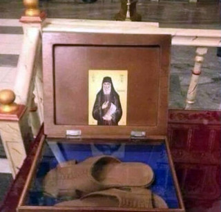 Δυο πλαστικές παντόφλες βαλμένες σε ξύλινη θήκη υπό μορφή λειψανοθήκης και μια εικόνα του Αγίου Παϊσίου, τοποθετήθηκαν σε τραπέζι στο Ναό προκειμένου οι πιστοί να τις… προσκυνήσουν.