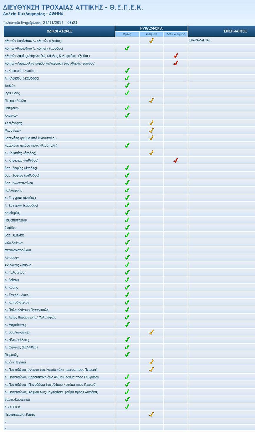 Σύμφωνα με τη διεύθυνση Τροχαίας Αττικής, το πρωί της Τετάρτης 24.11, αυξημένη είναι η κίνηση στους παρακάτω δρόμους: