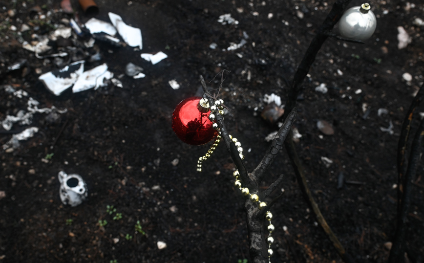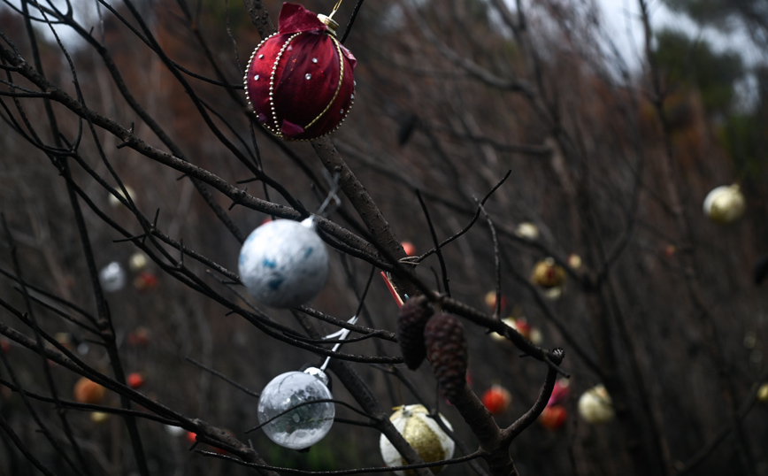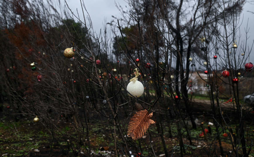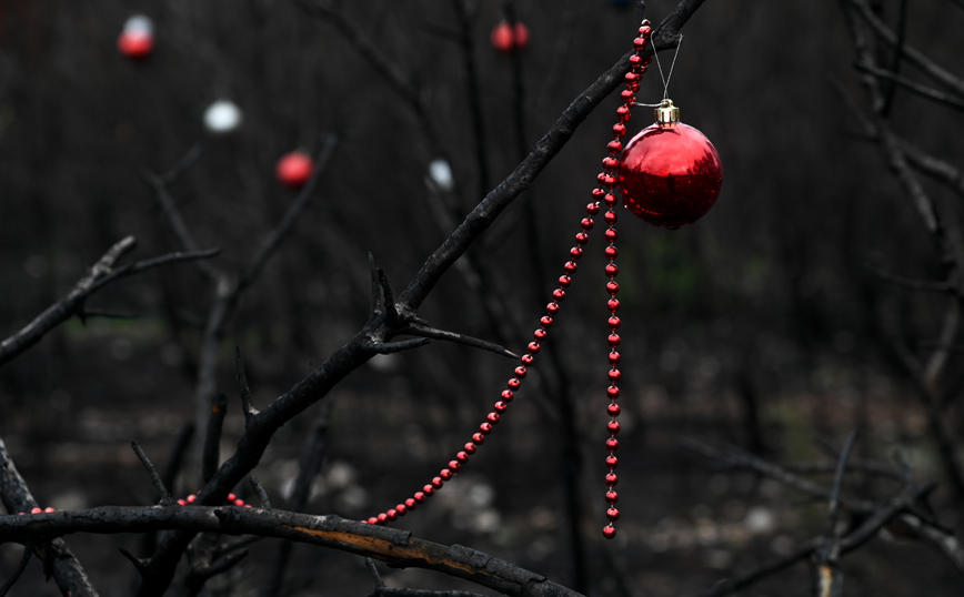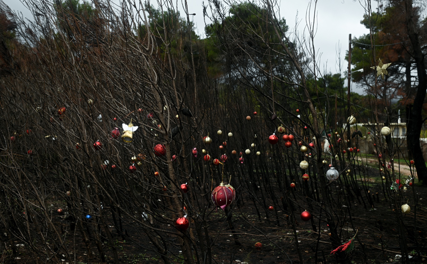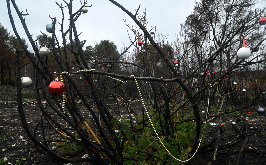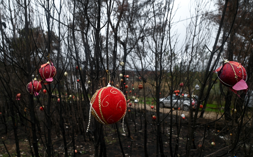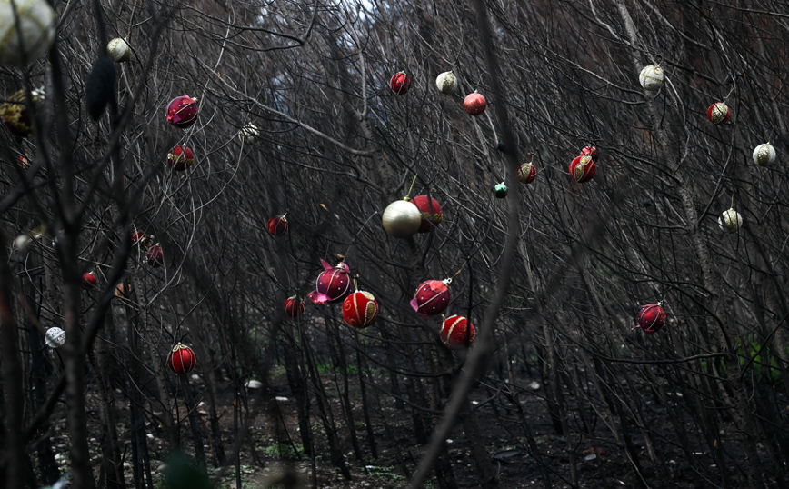 Οι φλόγες κατάπιαν ολόκληρα δάση και το πράσινο έδωσε τη θέση του στο απόλυτο μαύρο. Οι κάτοικοι της Βαρυμπόμπης αποφάσισαν όμως, ενόψει των Χριστουγέννων, να προσθέσουν πινελιές με λίγο χρώμα. Έτσι στόλισαν τα καμένα δέντρα με κόκκινες και πολύχρωμες μπάλες δίνοντας μια νότα αισιοδοξίας.