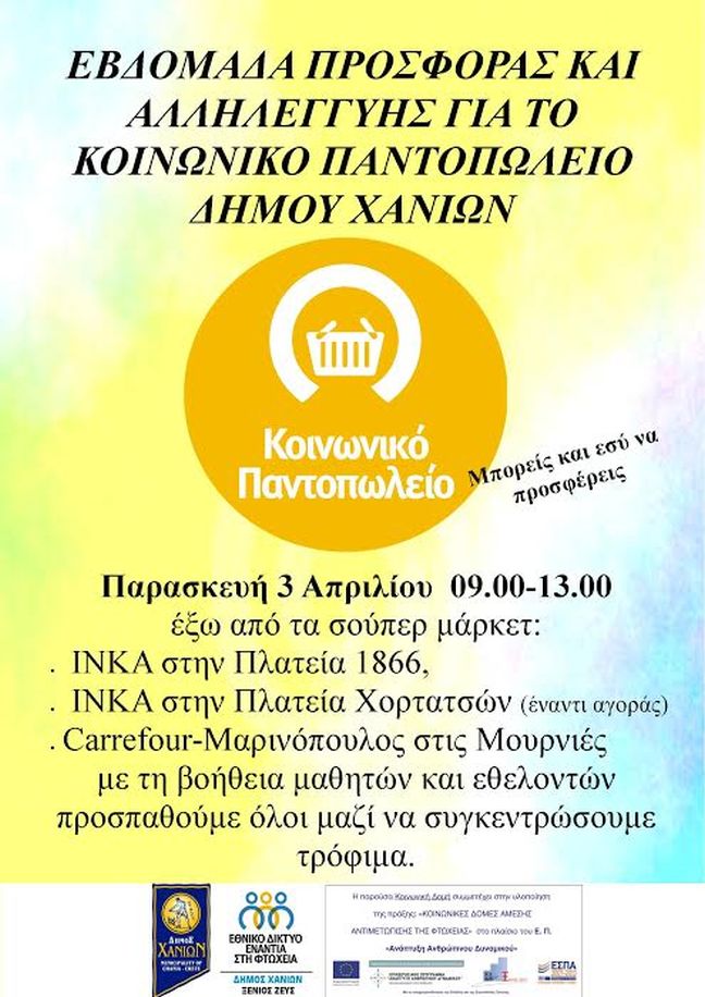 Οι εθελοντές του Κοινωνικού Παντοπωλείου στα Χανιά, σε συνεργασία με τους μαθητές του 2ου ΕΠΑΛ, θα συγκεντρώσουν σήμερα τρόφιμα έξω από κεντρικά σούπερ μάρκετ, στο πλαίσιο της Εβδομάδας Προσφοράς και Αλληλεγγύης του δήμου Χανίων.