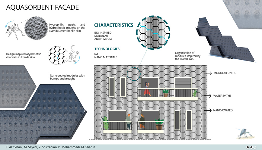 Σχεδιασμένες με εσοχές και προεξοχές στην επιφάνειά τους, οι προσόψεις, βοηθούν να διατηρηθούν τα μόρια του νερού ξεχωριστά από τον αέρα. Το νερό που συλλέγεται θα αποθηκεύεται σε κάθετες δεξαμενές ενσωματωμένες στην πρόσοψη του κάθε ορόφου. Με τη ρύθμιση των κυψελών ανάλογα με τη φορά της βροχής σε κάθε περιοχή, η συλλογή νερού από υγρασία και βροχοπτώσεις θα είναι δυνατή σε όλα τα διαφορετικά κλίματα. Οι κριτές είναι ενθουσιασμένοι με την λύση που καταπολεμά την έλλειψη νερού ανά τον κόσμο: «Αυτό το καινοτόμο project καταπολεμά την λειψυδρία και προσωπικά μου άρεσε ιδιαίτερα η έμπνευση απευθείας από τη φύση», λέει ο Stefan Schmied, Leader, Business Unit Projects, LIXIL EMENA. O Paul Finch, Programme Director του World Architecture Festival προσθέτει «Όλοι οι κριτές εκτίμησαν την ιδέα και την υλοποίηση της νάνο-τεχνολογίας που θα μπορούσε να βοηθήσει να λυθεί το πρόβλημα της λειψυδρίας σε περιοχές του πλανήτη που υπάρχει ανάγκη».