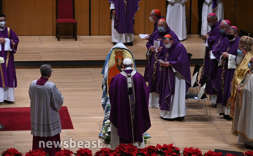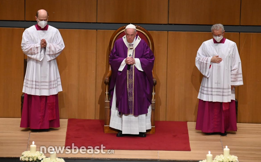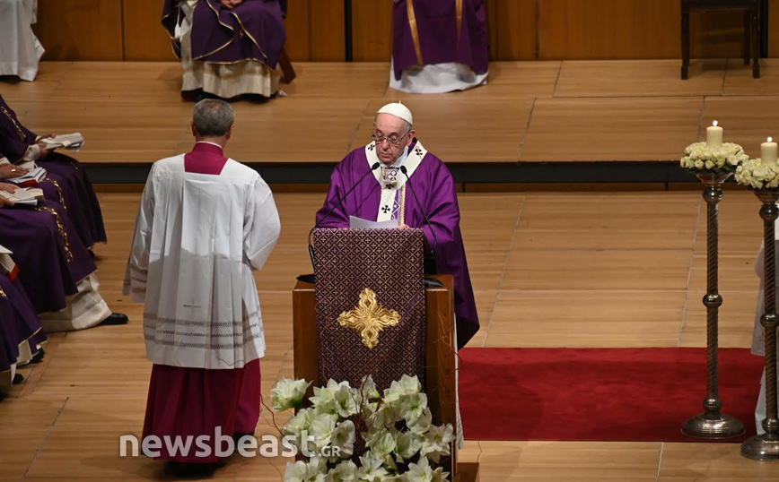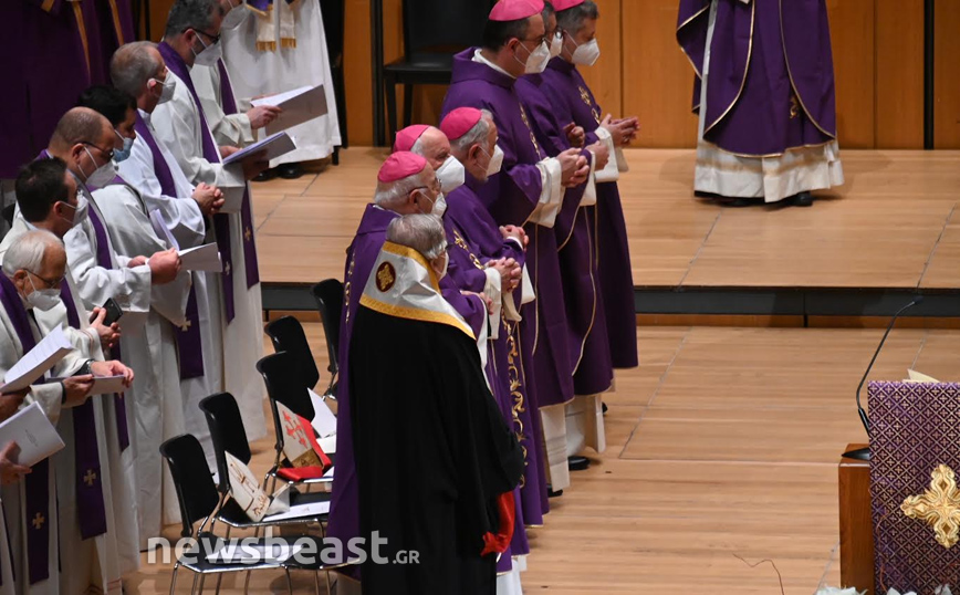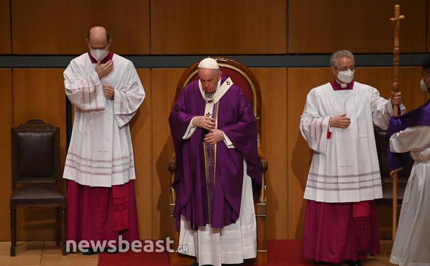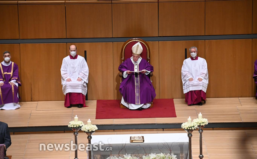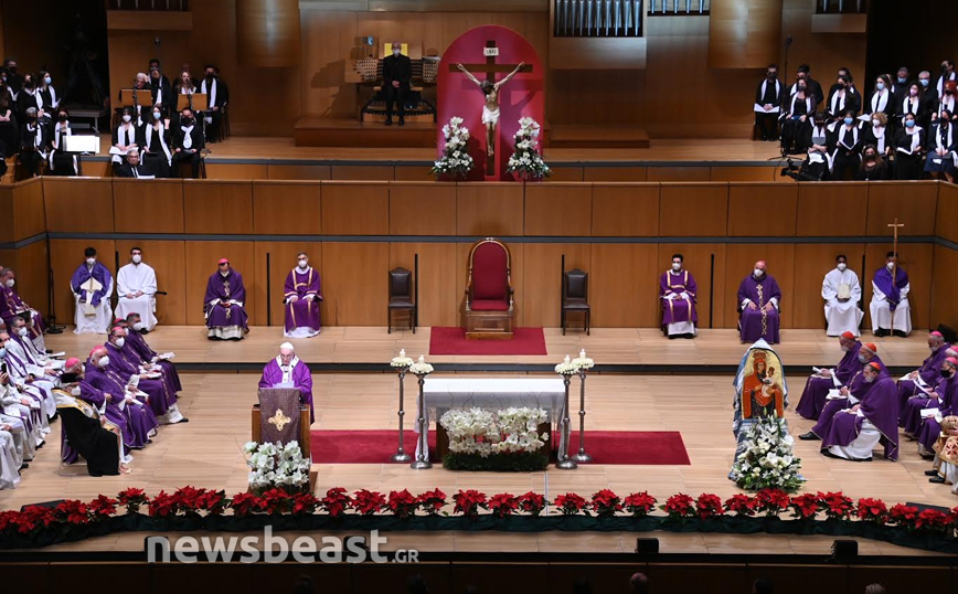 Η Καθολική Θεία Λειτουργία, τελείται στο πλαίσιο της τριήμερης επίσκεψης του Πάπα Φραγκίσκου στην Ελλάδα και πραγματοποιείται στην κεντρική αίθουσα του Μεγάρου, Χρήστος Λαμπράκης.