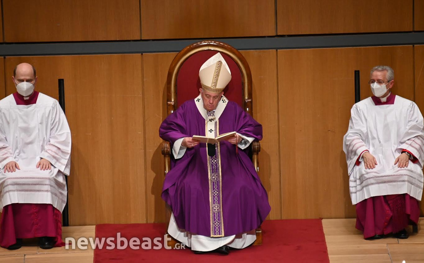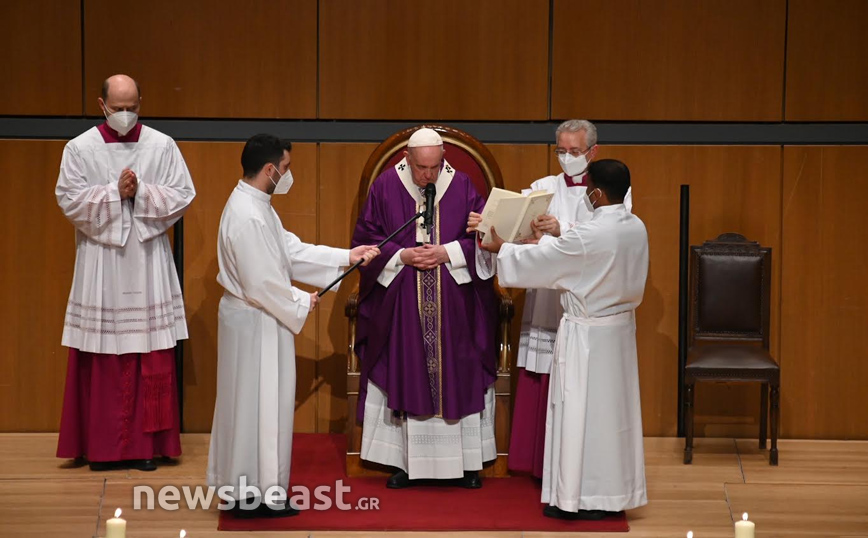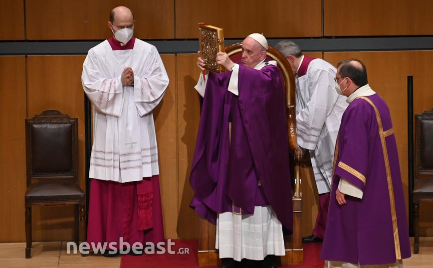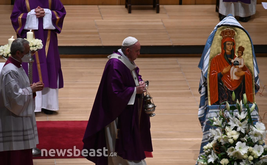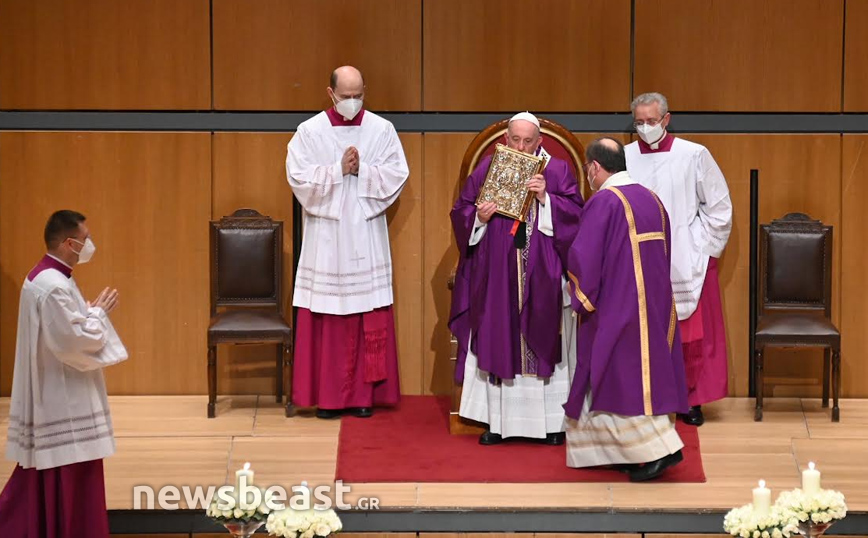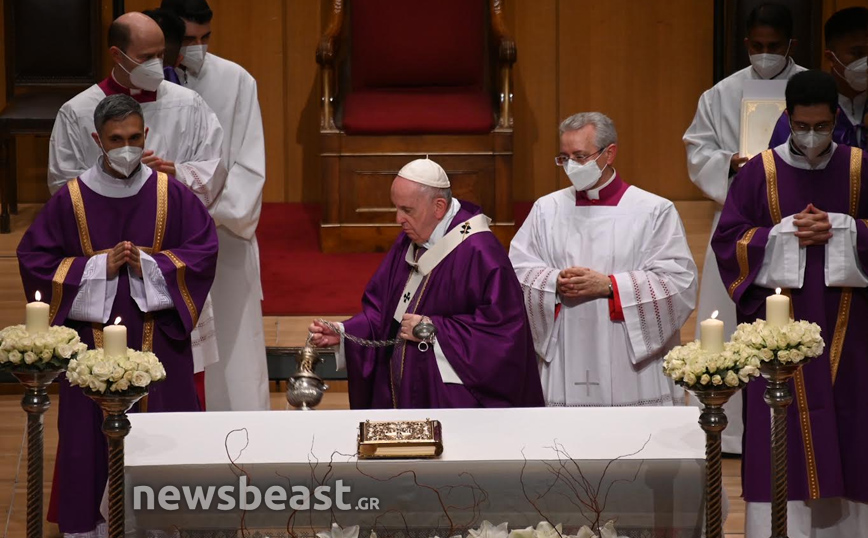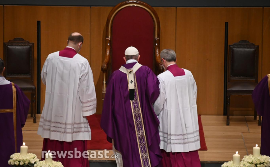 Η Καθολική Θεία Λειτουργία, τελείται στο πλαίσιο της τριήμερης επίσκεψης του Πάπα Φραγκίσκου στην Ελλάδα και πραγματοποιείται στην κεντρική αίθουσα του Μεγάρου, Χρήστος Λαμπράκης.