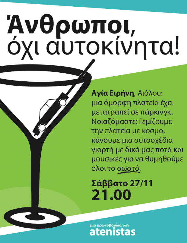 Το Σάββατο 27 Νοεμβρίου πάμε πλατεία. Φέρνουμε το δικό μας ποτό, τις δικές μας μουσικές, γεμίζουμε την πλατεία με ανθρώπους και όχι με αυτοκίνητα. Όπως πρέπει δηλαδή. Οι atenistas δίνουν ραντεβού στις 21:00 το βράδυ στην Αγία Ειρήνη (Aιόλου) και στην πολύπαθη πλατεία της που μετατρέπεται καθημερινά σε πάρκινγκ.