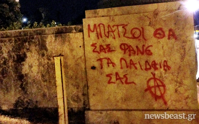 Συνθήματα στον περίβολο της Βουλής και συγκεκριμένα στον τοίχο που βρίσκεται στην πλευρά της οδού Βασιλίσσης Σοφίας έγραψε ομάδα αγνώστων, στο πλαίσιο της πορείας διαμαρτυρίας για την απελευθέρωση των κρατουμένων αντιεξουσιαστών το βράδυ της Τρίτης.